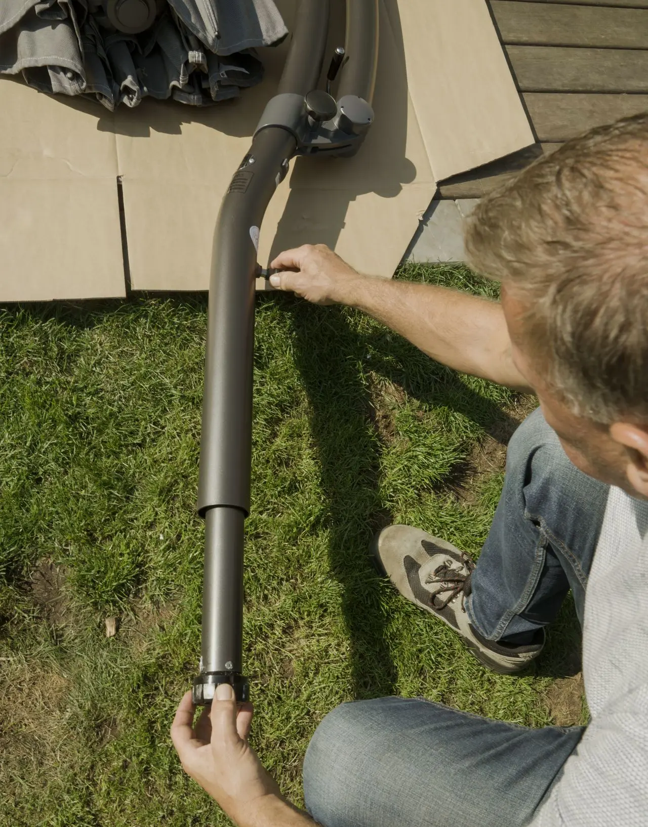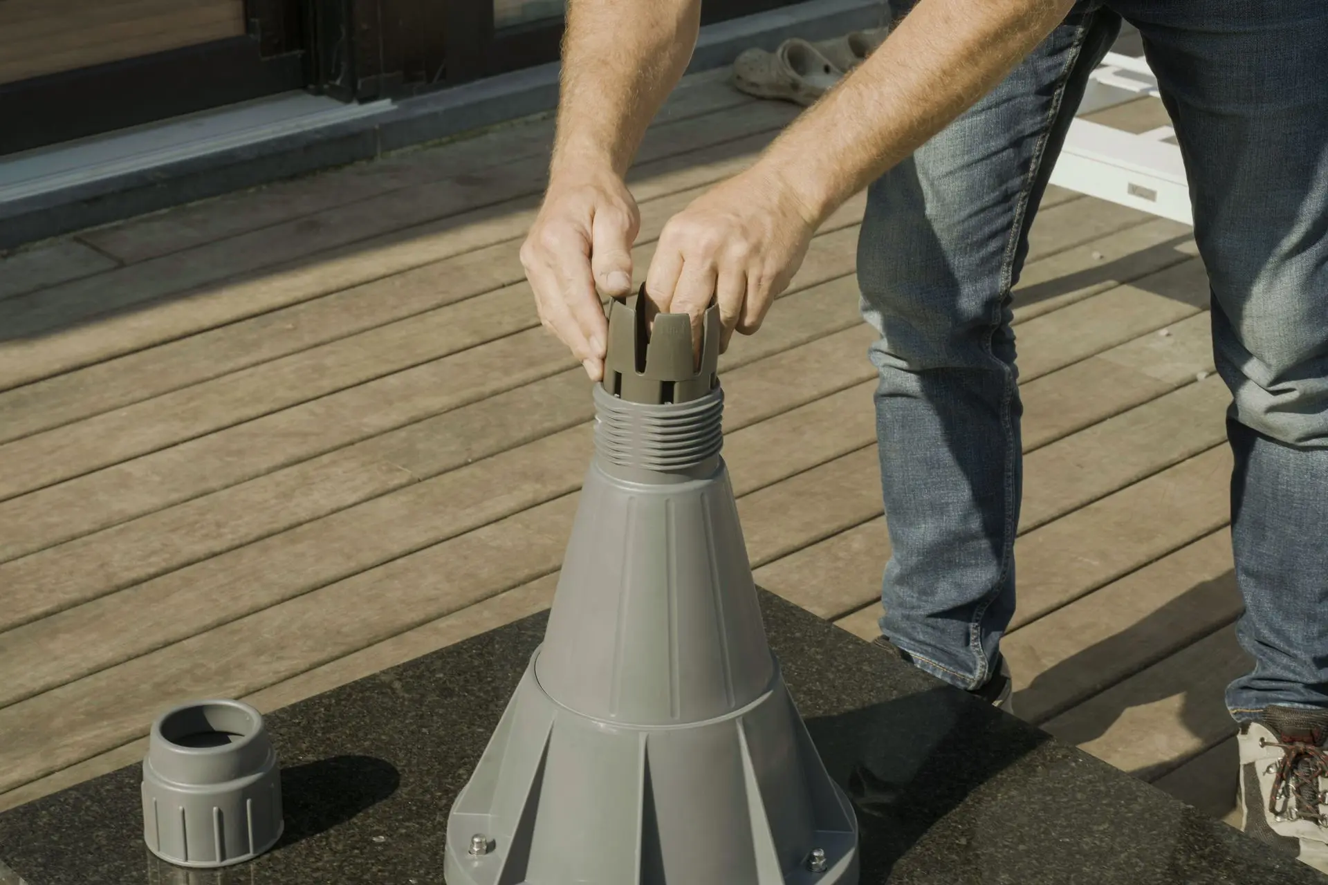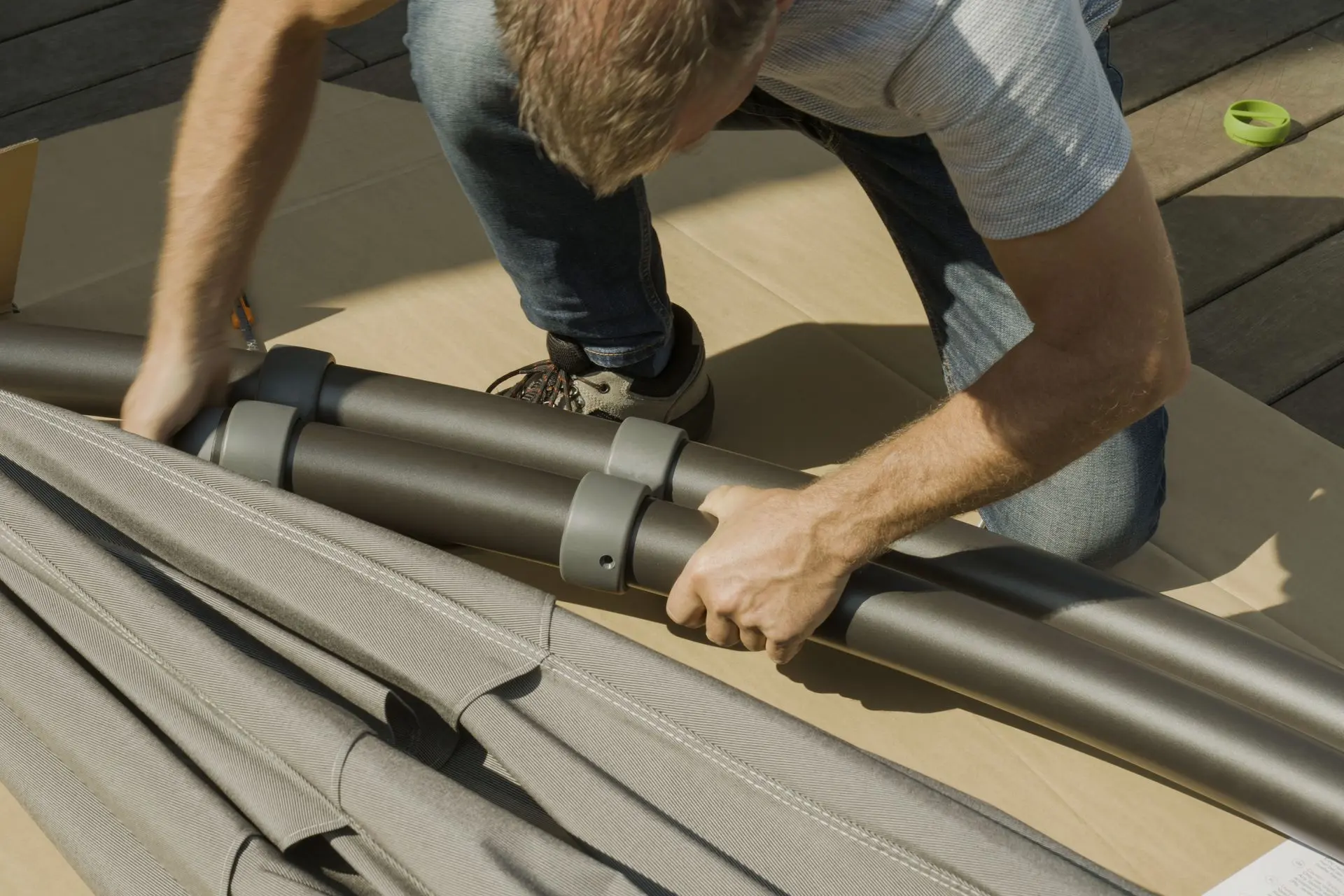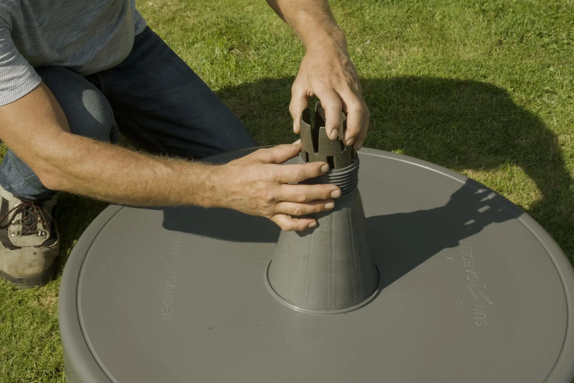 - Zodra de voet van de zweefparasol verzwaard is, plaats je de mast in de voet en draai je de huls rond de mast aan om de hangparasol veilig te bevestigen
