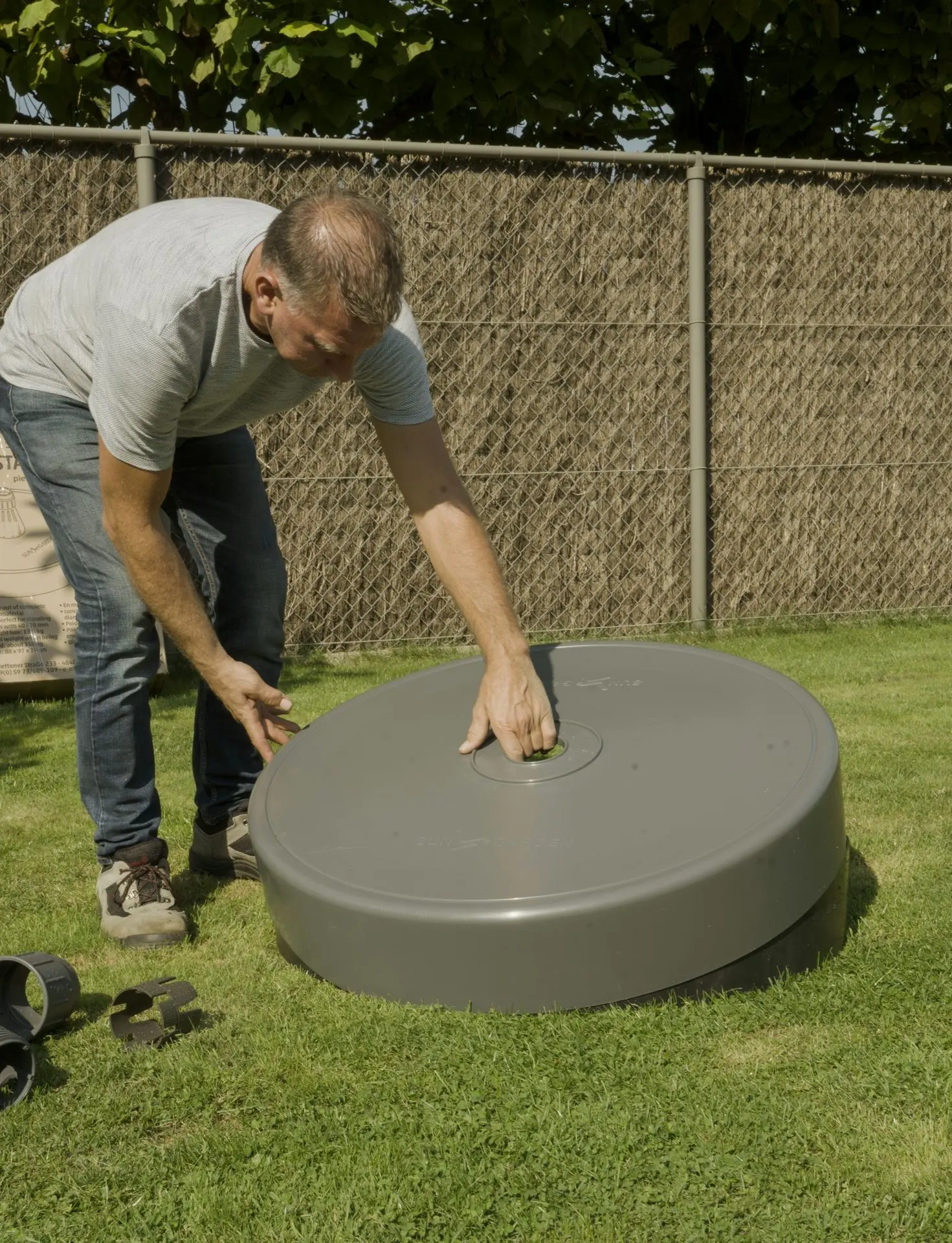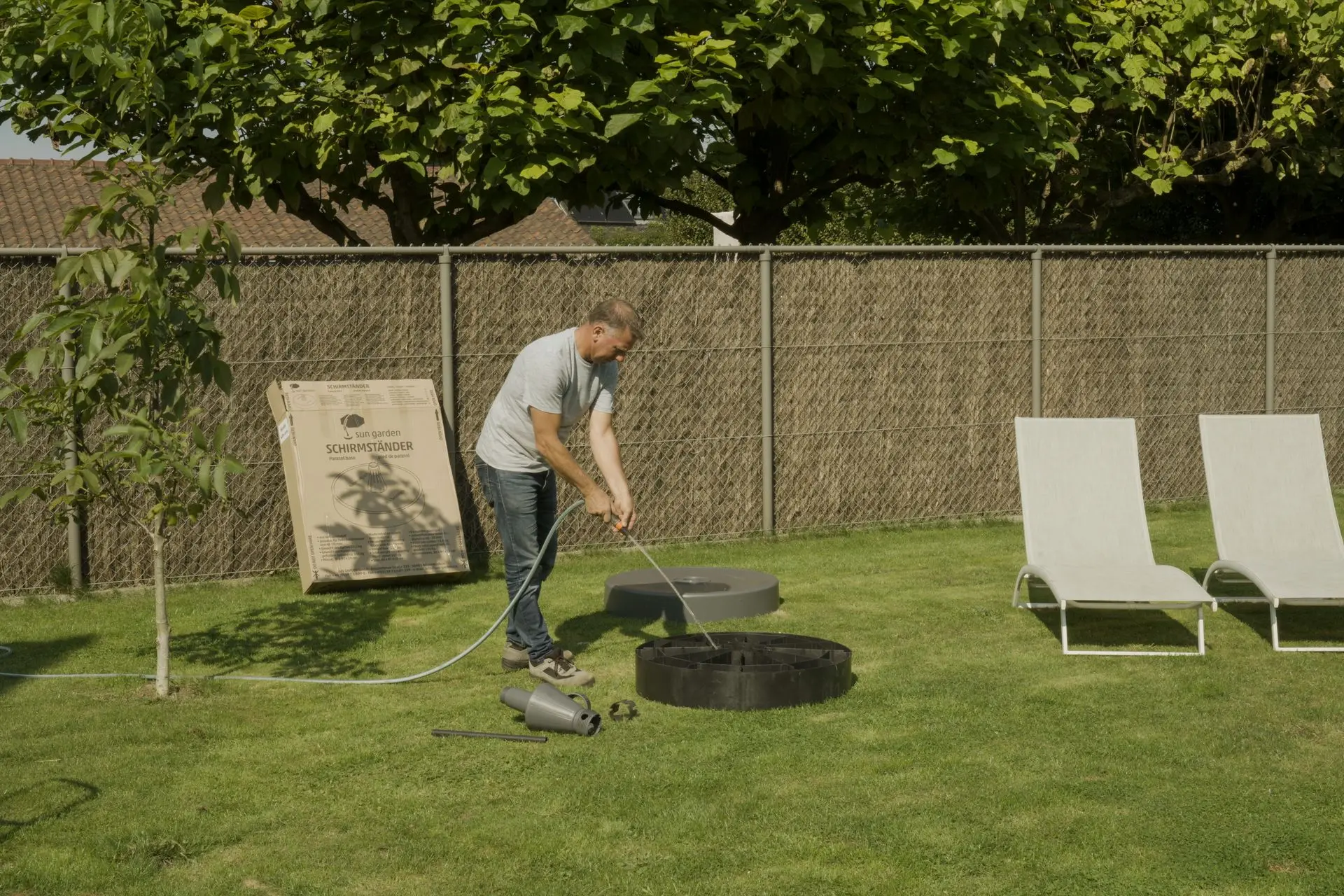 - Vul de onderkant van de parasolvoet tot aan de rand, ongeveer 140 kg, met een mengsel van zand en water, eventueel ook grind